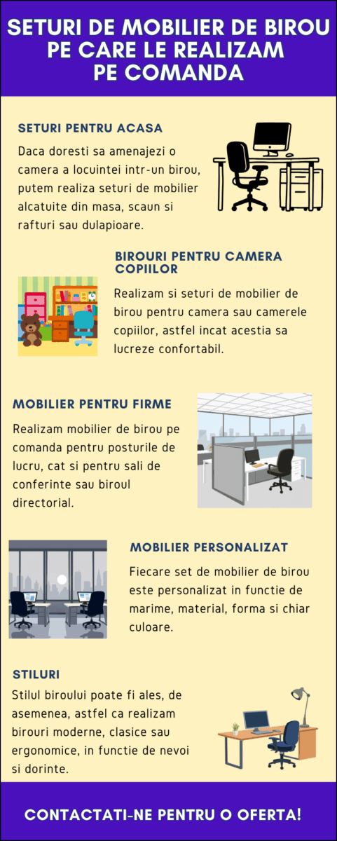 Asadar, daca ai nevoie de un set de mobilier de birou pe comanda, nu ezita sa ne contactezi pentru o oferta de pret!